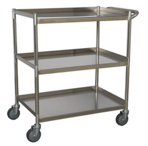 - Grade 304 stainless steel workshop trolley with three 30kg capacity shelves.