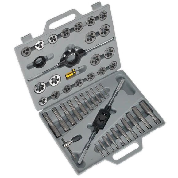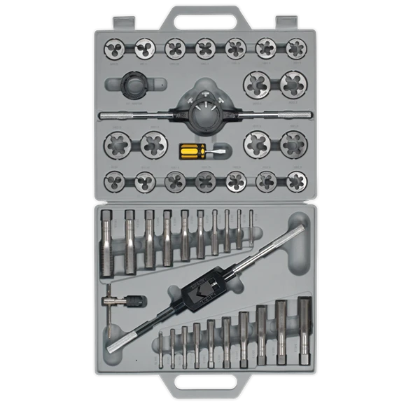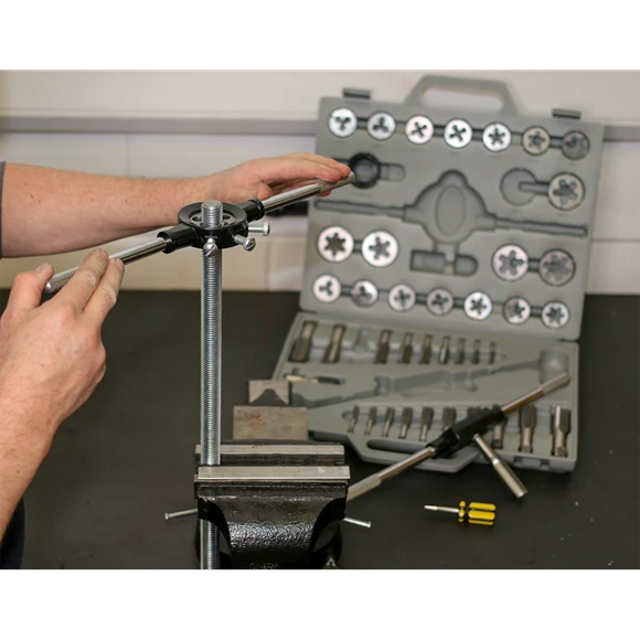 - Also includes sliding jaw type tap wrench and T-Bar type tap wrench together with steel die holder with knurled screws.
