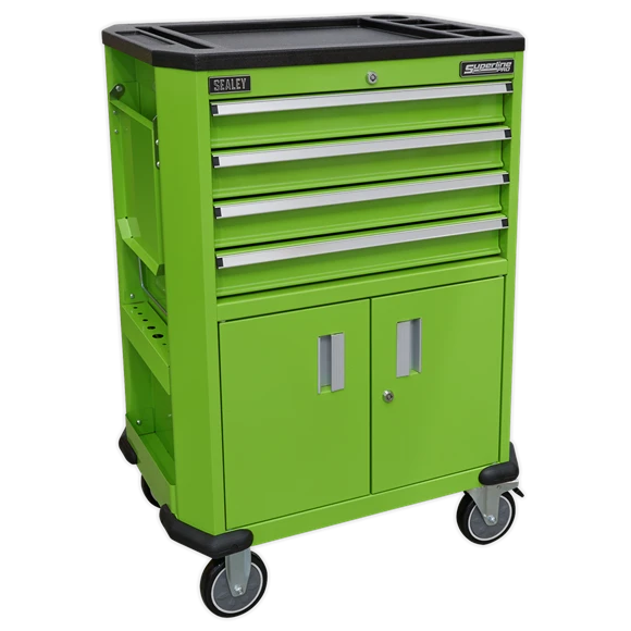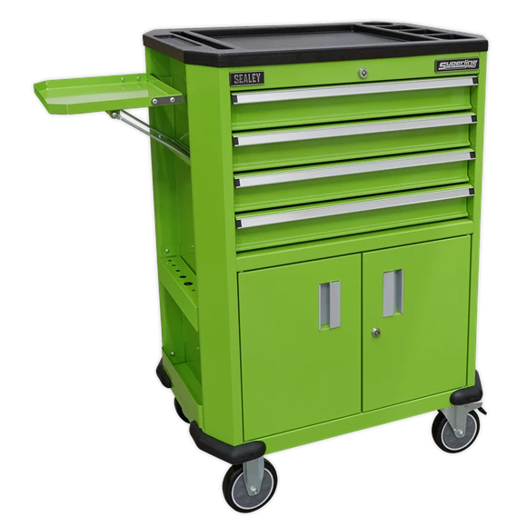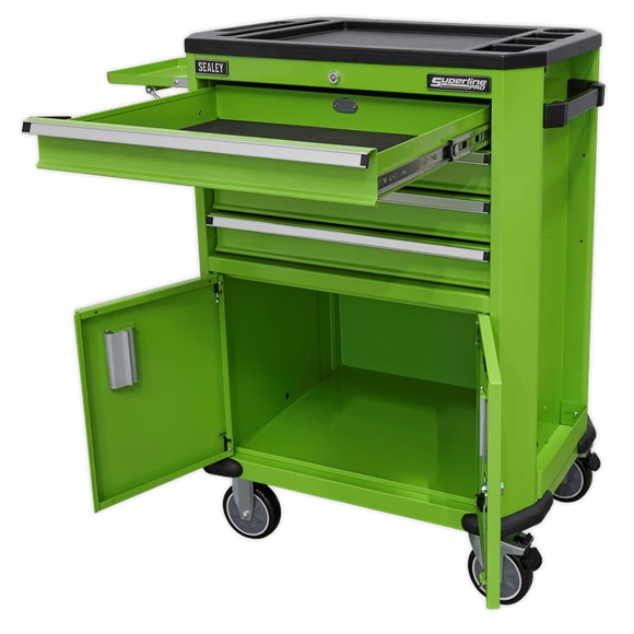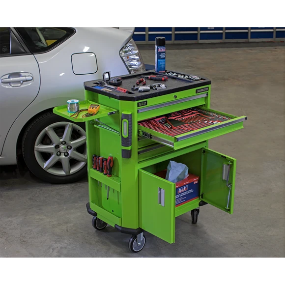 - Top of the trolley is covered in tough composite with built-in storage for small parts.