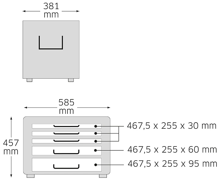 - Â 5 easily removed lockable drawers with transparent covers, with end-stops for the extendable rails, 3 different drawer heights.