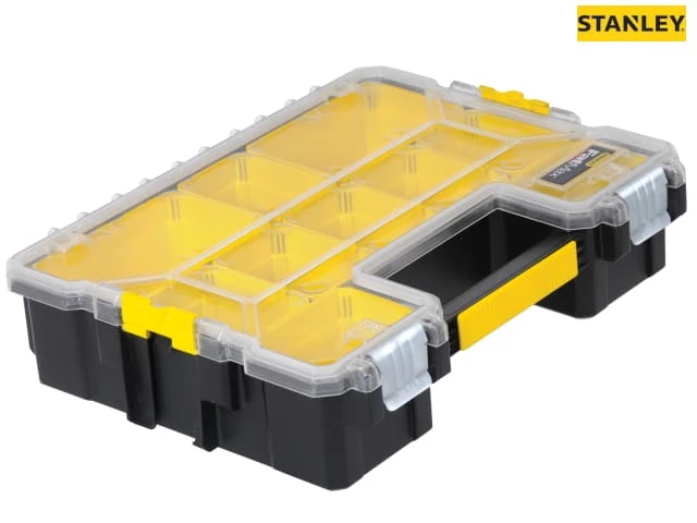 - The Stanley FatMax® Deep Professional Organiser has 10 removable storage compartments, providing storage for small parts, components or accessories, which can also be stacked together for use outside the organiser. Made from polypropylene, the organiser has a virtually unbreakable lid allowing the contents to be viewed easily and features a waterproof seal that not only prevents water, but also rust and foreign particles from entering.A plastic handle with textured grip allows the organiser to be moved comfortably, while the organiser’s lid has been specially designed to ensure that the compartments are held securely in place and fastens with two metal latches. For added versatility, multiple organisers can be clipped together using the side latches for easy transportation.